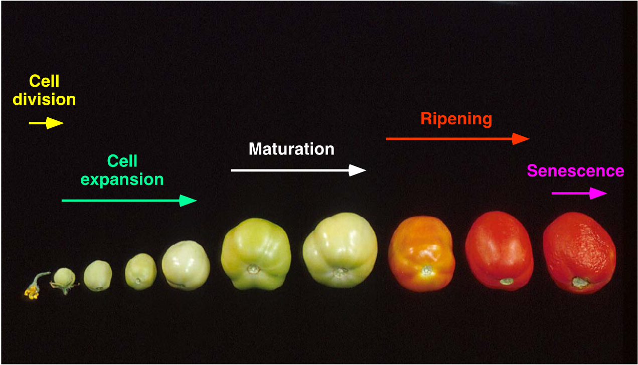 Fruit development can be divided into a series of stages, as shown here for tomato. Early in development fruit are enlarging rapidly and are small, hard, green and accumulating organic acids. The seeds become mature prior to ripening. During ripening fruit become soft textured, and accumulate soluble sugars, pigments and aroma volatiles. Eventually fruit will become over-ripe, cell structures will deteriorate and the fruit will become susceptible to pathogens. (Photograph courtesy D.A. Brummell)