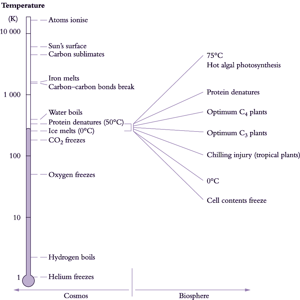 Figure 14.1. Plant growth within the earth's biosphere is limited to a narrow range of temperatures compared with the overall cosmic span from absolute zero, where molecular motion ceases, to 10 000 K where atoms are ionised. Taking the life zone as spanning -5 °C to 45 °C vascular plants show remarkable thermal resilience within this range which enables them to colonise a great diversity of habitats. (Values generalised from various sources)