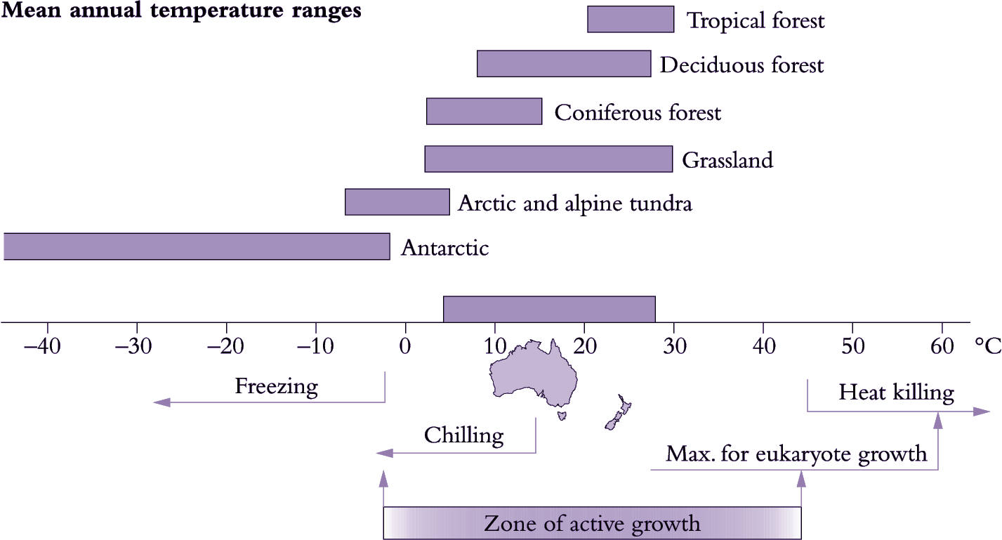 On a global scale (Figure 14.2) vegetation types have broad mean annual temperature ranges, from the arctic and alpine tundra at the low end of the temperature scale to tropical forests at the high end. Within this classification Australia and New Zealand cover a wide range of temperature conditions with mean annual temperatures varying from 4°C in the alpine areas of Australia and New Zealand to 28°C along the tropical northern coast of Western Australia.