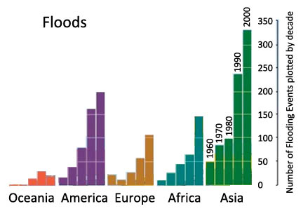 Figure 18.1 Flooding events in various regions of the world. Graphs show the number of floods classified as a disaster in the International Disaster Database of the University of Louvain, Belgium, for decades from 1950 through 2000. Floods resulted from rivers after heavy rainfall or snow melts, and coastal flooding. Data from the Millennium Ecosystem Assessment map (http://maps.grida.no/go/graphic/number-of-flood-events-by-continent-and-...).